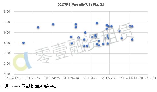 2017年租赁公司债发行利率主要集中于5%至7%区间,根据发行主体不同利率差异较大。发行利率最低的为平安租赁及海通恒信租赁于2017年7月所发行公司债的4.70%;发行利率最高的为聚信租赁于2017年8月所发行公司债的6.90%。