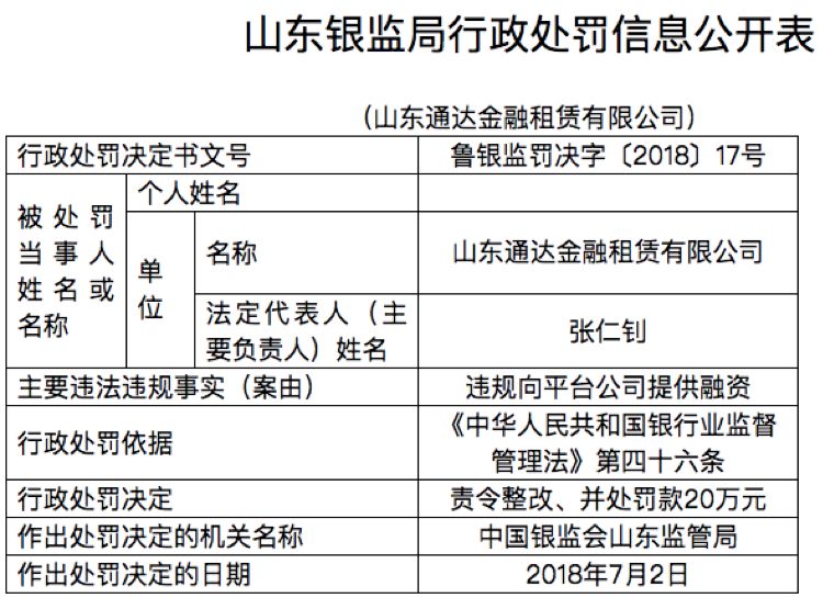 25日,山东银监局对山东通达金融租赁有限公司下发处罚书,因其违规向平台公司融资,根据《中华人民共和国银行业监督管理法》第四十六条责令整改、并处罚款20万元。