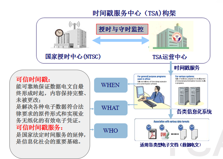 可信时间戳服务中心(TimeStampAuthority)由国家授时中心负责授时和守时保障,提供具有法律效力的可信时间戳签发服务,解决各种类型的电子数据、电子文件符合电子签名法要求的原件形式,保障数据电文至形成时起内容完整、未被更改,使电子数据文件具有法律效力。是用来证明电子数据产生时间和内容完整性的第三方。