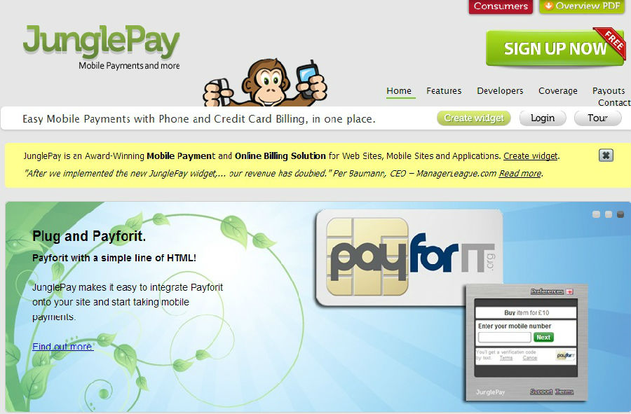 与Text2Pay一样,JunglePay为用户定制支付界面,主要支持短信、应用内计费、网页等,覆盖80个左右的国家。JunglePay的支付方式可选范围较大,包含短信、信用卡、电话,也可以通过语音拨打计费。